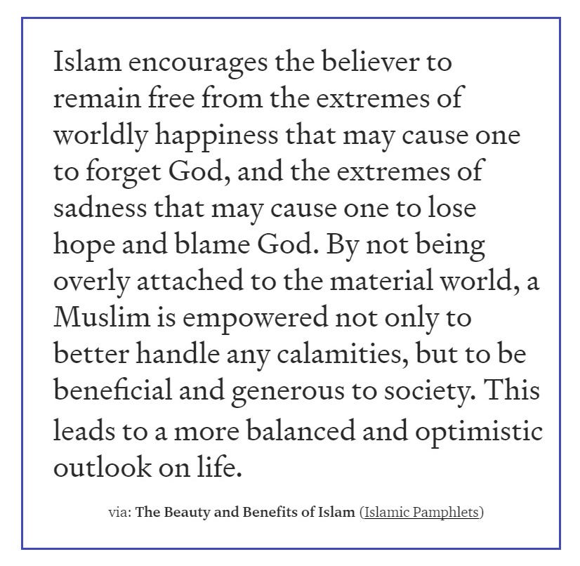 Islam encourages the believer to remain free from the extremes of worldly happiness that may cause one to forget God, and the extremes of sadness that may cause one to lose hope and blame God. By not being overly attached to the material world, a Muslim is empowered not only to better handle any calamities, but to be beneficial and generous to society. This leads to a more balanced and optimistic outlook on life.