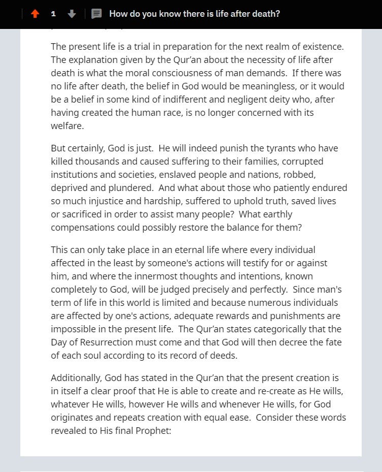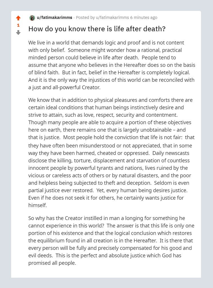 The present life is a trial in preparation for the next realm of existence. The explanation given by the Qur’an about the necessity of life after death is what the moral consciousness of man demands. If there was no life after death, the belief in God would be meaningless, or it would be a belief in some kind of indifferent and negligent deity who, after having created the human race, is no longer concerned with its welfare.