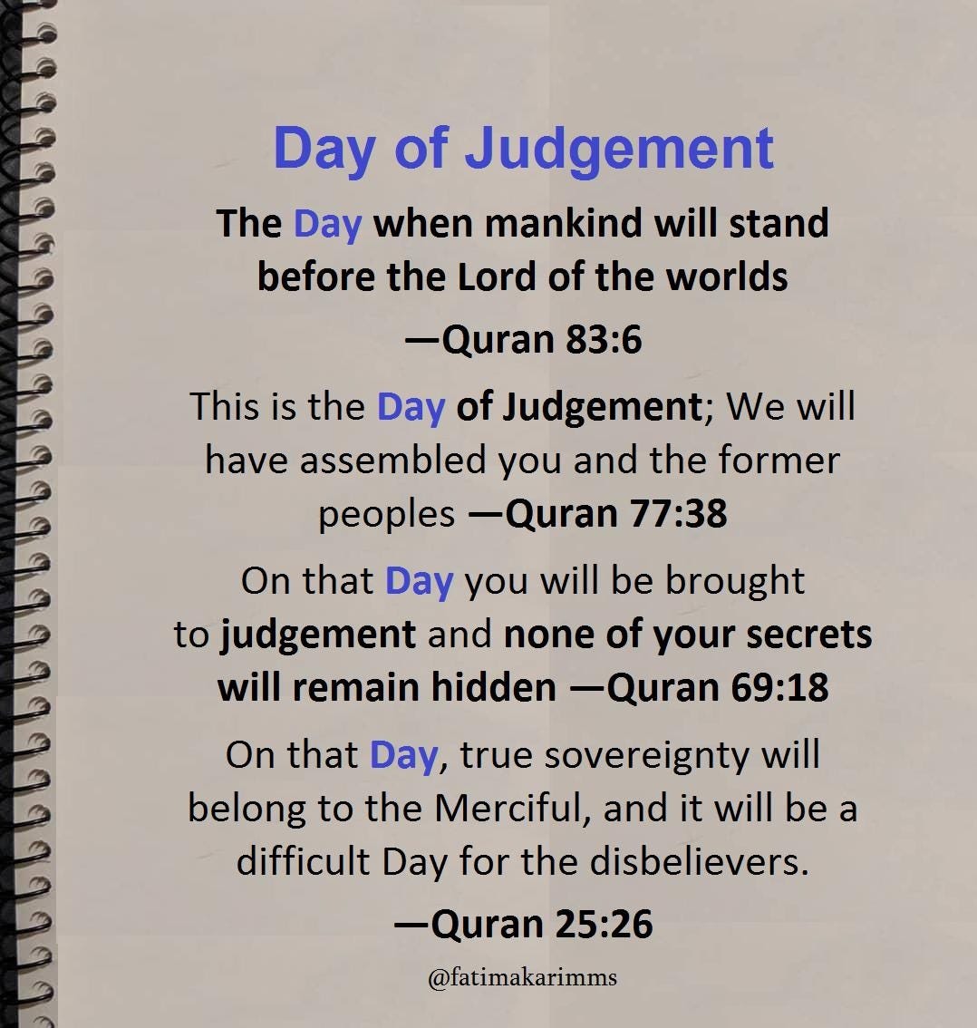 A day will come when the whole universe will be destroyed and the dead will be resurrected for judgment by God. This day is the Day of Judgment. On that day, all people will be rewarded by God according to their beliefs and deeds.